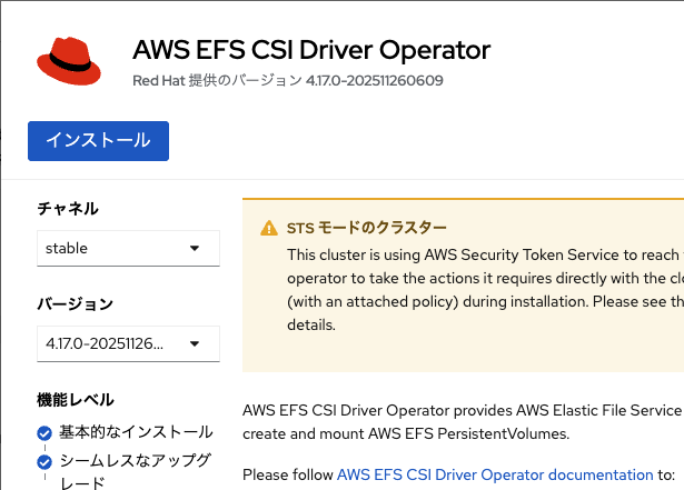 ROSA(OCP)からEFSを使用するには AWS EFS CSI Driver Operator が必要です。
