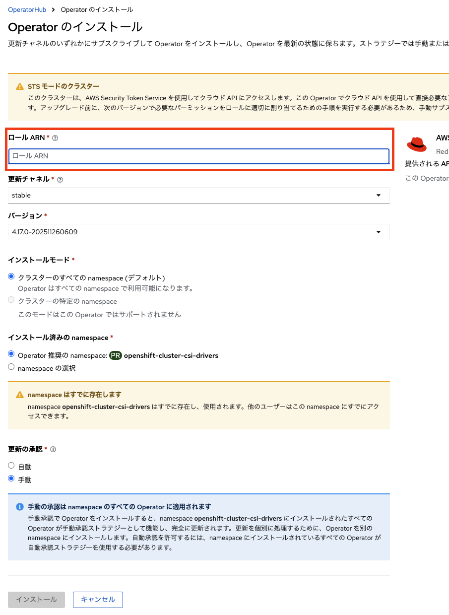 ロール ARN に先ほど取得したARNを入力して インストール をクリックします。